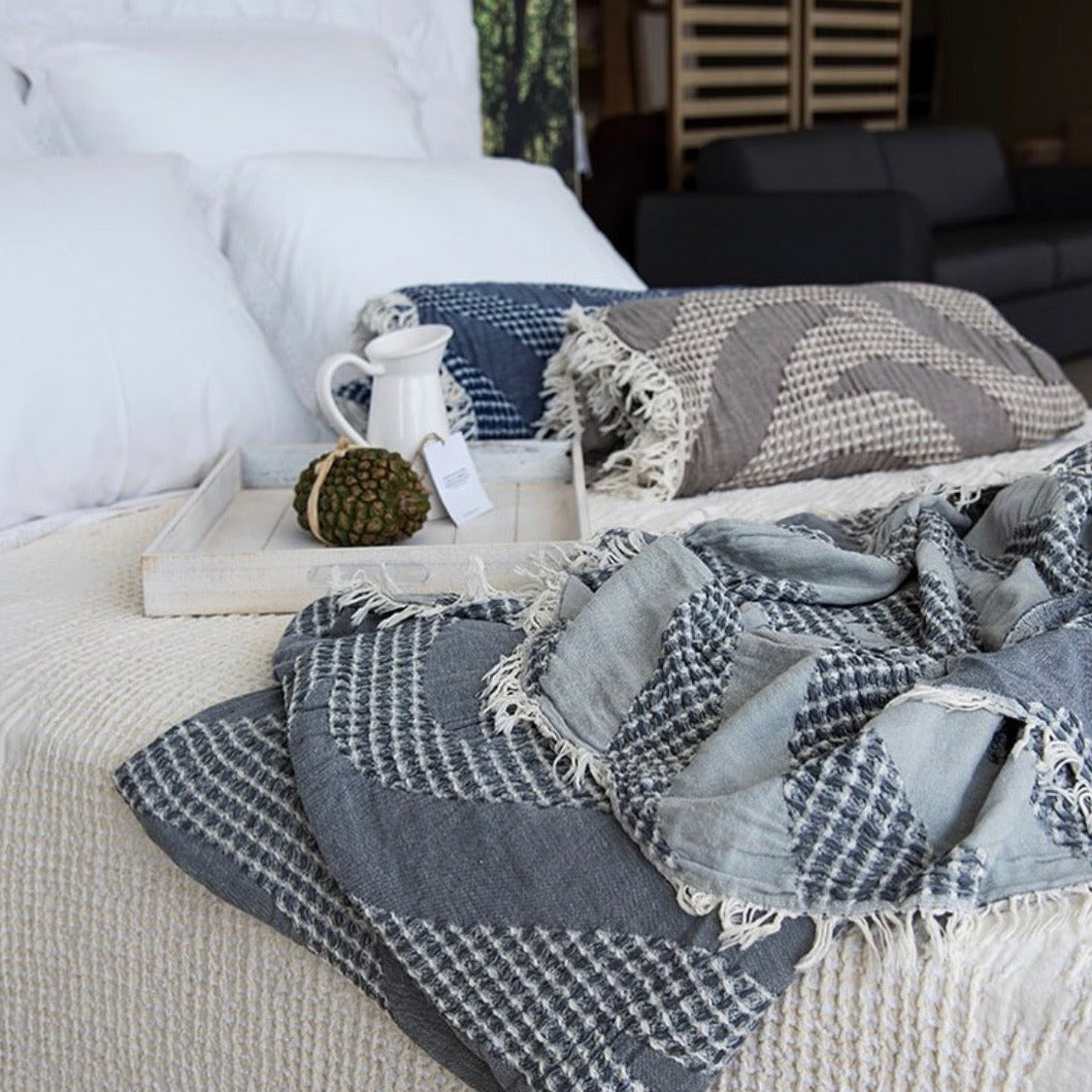 Crafted exclusively from premium Greek cotton, our blankets offer a luxurious feel against your skin. Their natural fibres provide breathability and insulation, ensuring you stay comfortable in all seasons. Whether you're curling up on the couch, adding an extra layer to your bed, or picnicking by the seaside, these blankets are your perfect companion.